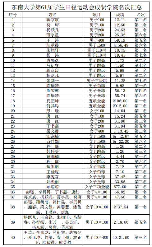 近日草榴社区 第61届学生田径运动会圆满结束,我院田径队运动健儿取得了男女团体总分第二名(第一名为交通学院)的傲人成绩,同时还获得男子团体总分第二名和女子团体总分第二名(获奖名单附后),所有参赛运动员都展现出了成贤学子求真求美、成人成贤的风采。